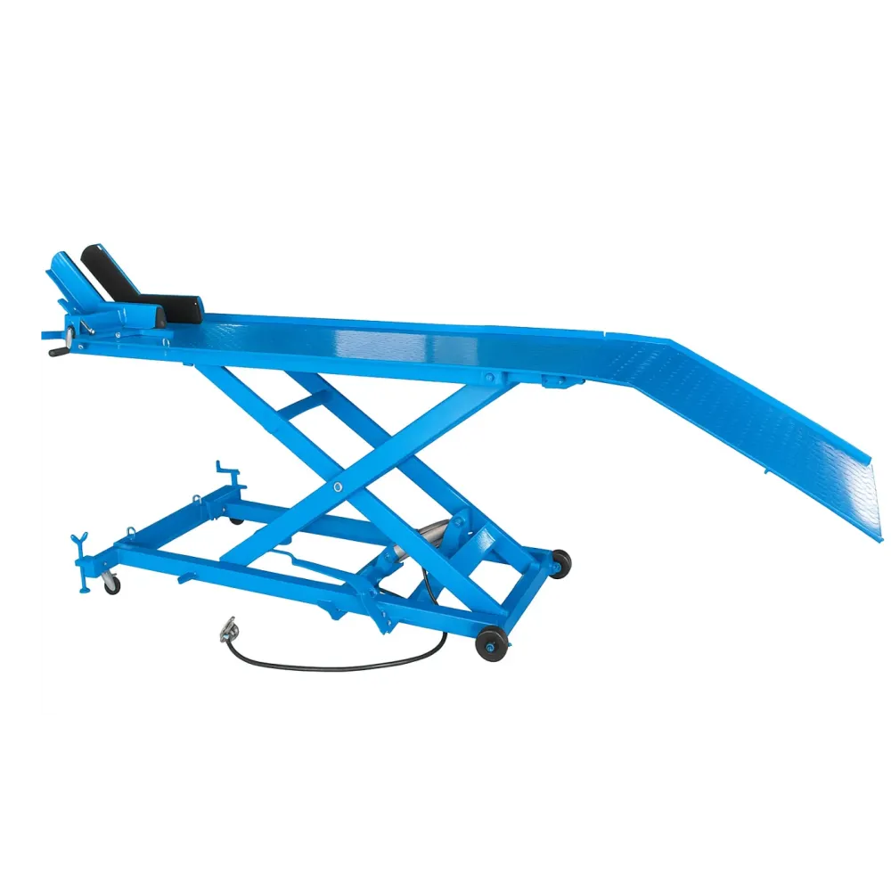 Hydraulisk/luft løftebord til MC.Perfekt for hobbymekaniker Kan styres med luft (mates fra kompressor) eller bruk av fotpumpe (manuell) Maksimum vekt 450kg Minimum løftehøyde - 21cm Maksimum løftehøyde - 78 cm...
